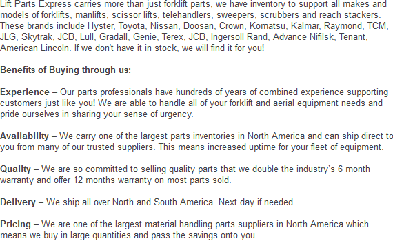 We have fantastic prices on all our forklift parts. Give us a call today if you have an interest in getting a price estimate on our parts or attachments. Call us at: